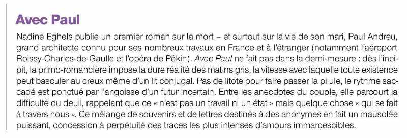 Ce qui est difficile, ce n’est pas écrire, la mémoire s’entrouvre et les mots affleurent, je n’ai parfois qu’à les cueillir et les ordonner. Mais trouver le juste ton. La bonne distance. Pour transmettre ces émotions singulières ressenties aux côtés de l’homme qu’était Paul. Un homme oui, mon amoureux mon amant mon mari, mais aussi un architecte, un créateur. Vivre au contact de la création génère des émotions particulières. Des hauts et des bas, un peu plus hauts, un peu plus bas que la moyenne, j’allais dire que « le commun des mortels », mais je sais maintenant que même les moins communs le sont, mortels.