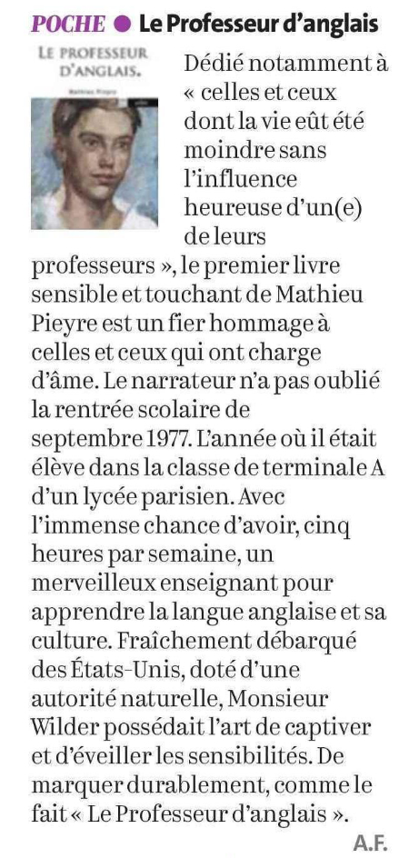 À l’époque où commence cette histoire, Monsieur Wilder incarnait la fougue, l’impétuosité attachées à sa jeunesse. C’était son premier poste en lycée en France, il venait de passer deux ans en Californie comme lecteur dans une université.