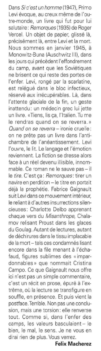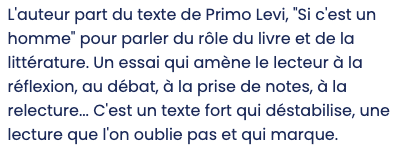 Primo Levi écrit dans Si c’est un homme comment un roman a accompagné, dans un baraquement du camp d’Auschwitz III-Monowitz, le jeune homme de vingt-cinq ans qu’il était, malade, et qui ignorait alors si ses voisins de lit et lui-même allaient être exécutés.